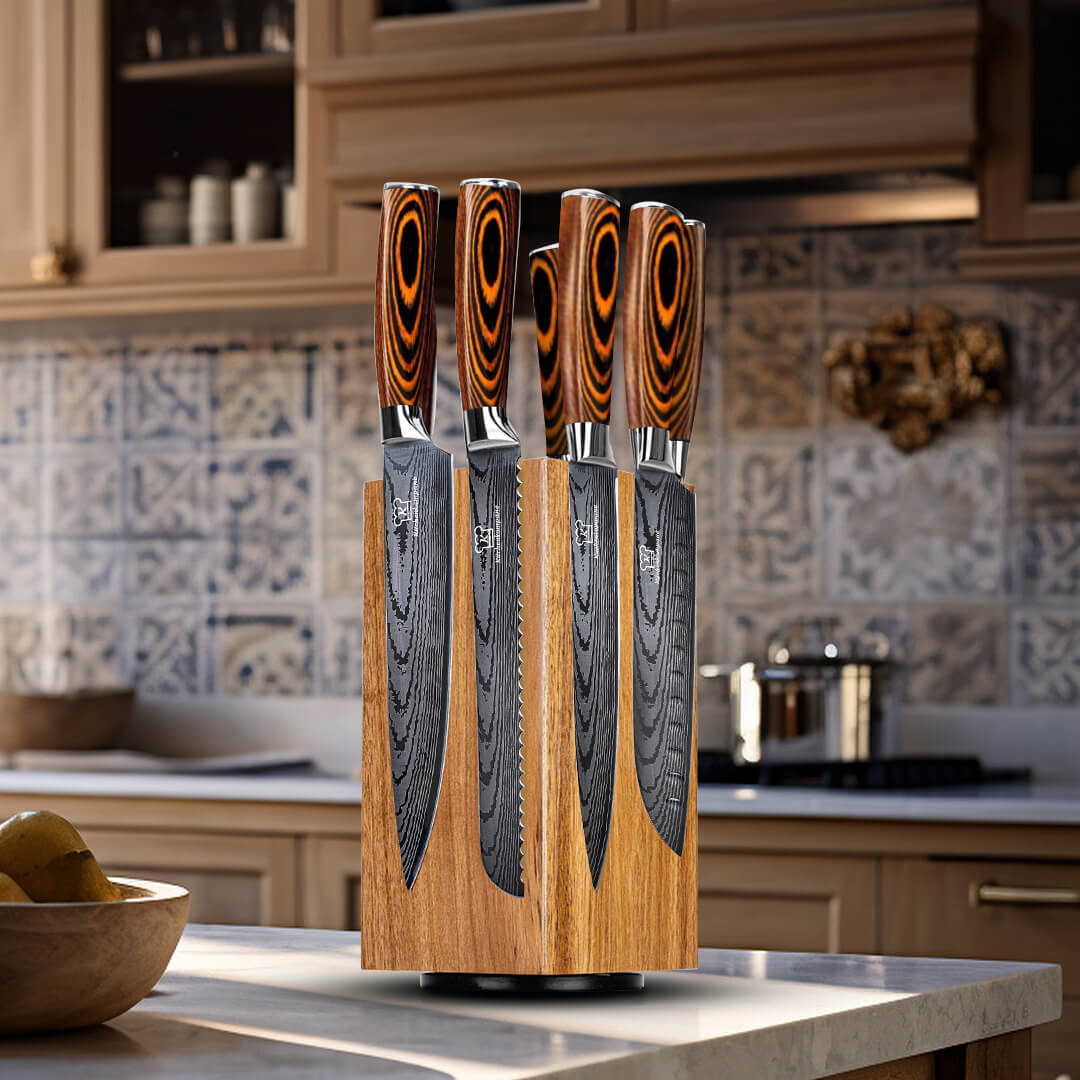 Bewahre deine Klingen sicher auf, wenn du sie nicht benutzt, indem du sie in einem Messerblock oder einem Halter deiner Wahl aufbewahrst.