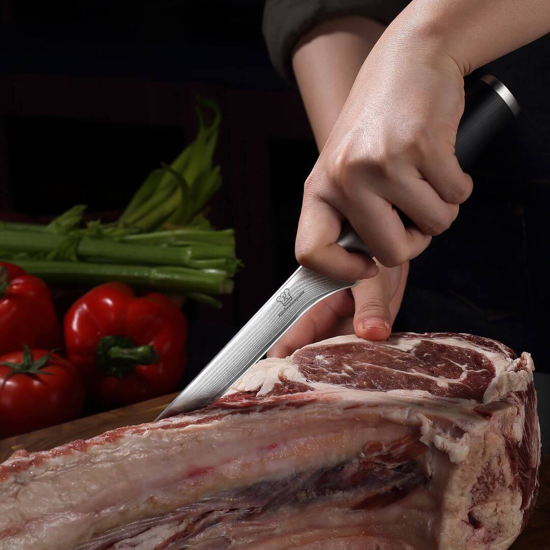Feinste Schnittführung trifft auf japanische Perfektion: Das OKAMI Ha Ausbeinmesser aus 67 Lagen hochwertigem Damaszenerstahl bietet mit einer Härte von 62 HRC absolute Präzision beim Zerlegen von Fisch und Fleisch. Der rostfreie Stahl ist extrem robust, korrosionsbeständig und auf maximale Lebensdauer ausgelegt.